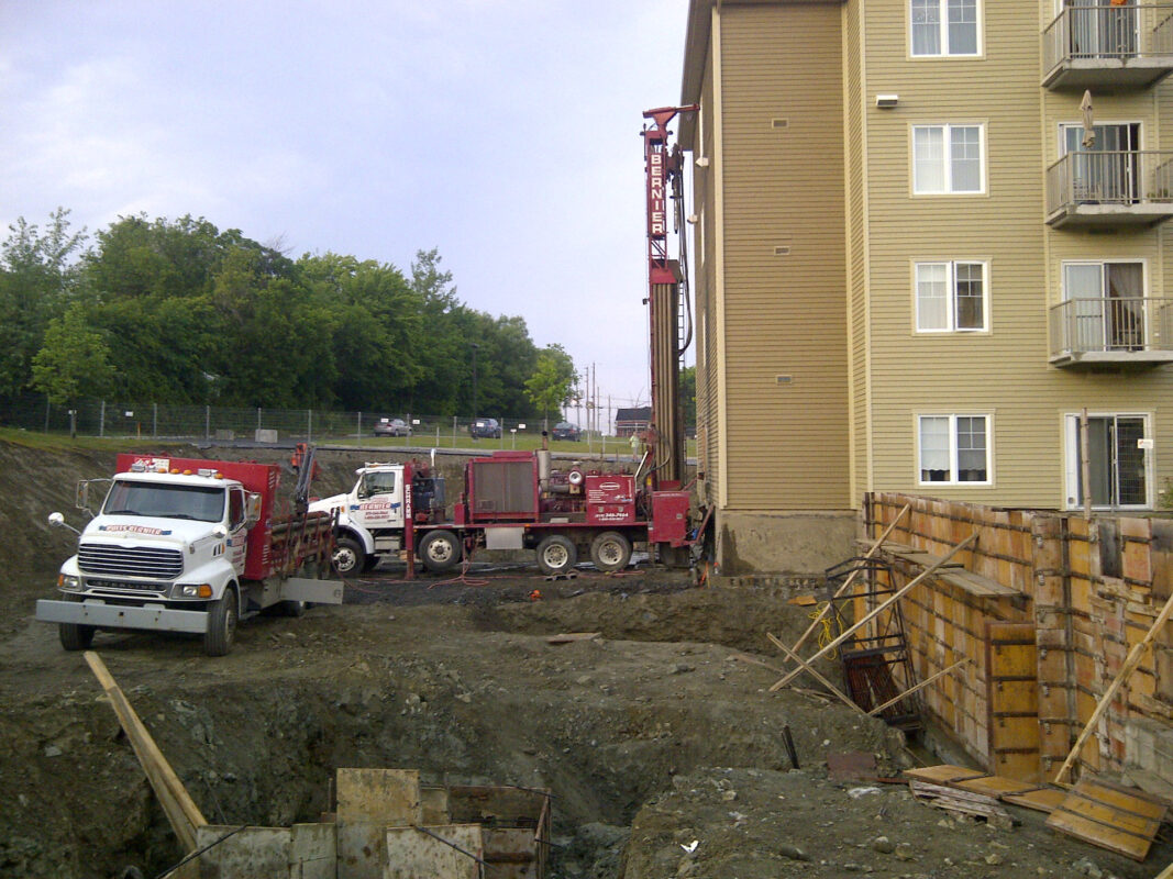 Puits Bernier a été mandaté pour effectuer le forage de soutien d’un mur berlinois. Le mur à été érigé pour soutenir la poussée latérale du terrain meuble autour du bâtiment. L’ouvrage temporaire à servi à la réalisation de travaux sur la fondation autour de l’immeuble.